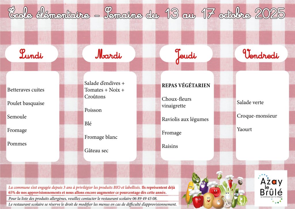 Les tarifs pour l’année scolaire 2025 / 2026 seront de 3,00 € par jour et par enfant et de 4,00 € pour les agents communaux et 4,80 € pour les adultes autres que les agents communaux (Délibération N° 2025-06-01 du Conseil municipal du 24 juin 2025).