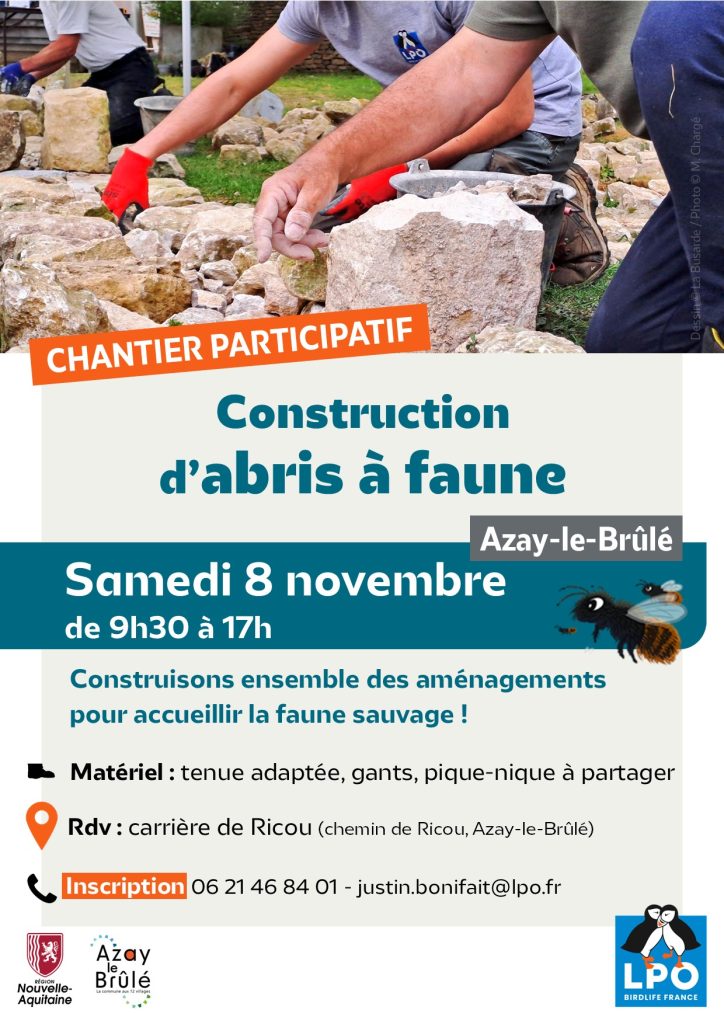 Le temps d’une journée, venez vous joindre à nous pour construire ces trois abris à faune, sur le site de la carrière de Ricou, à Azay-le-Brûlé (79).