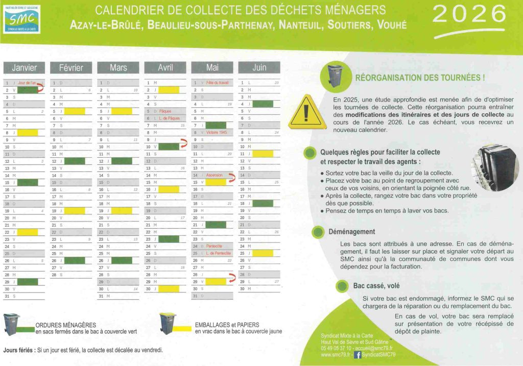 Le SMC assure la collecte des ordures ménagères sur notre territoire. Il a uniformisé, sur notre commune, la collecte des ordures ménagères et des emballages en bacs individuels. Les bacs sont collectés alternativement une semaine sur deux.